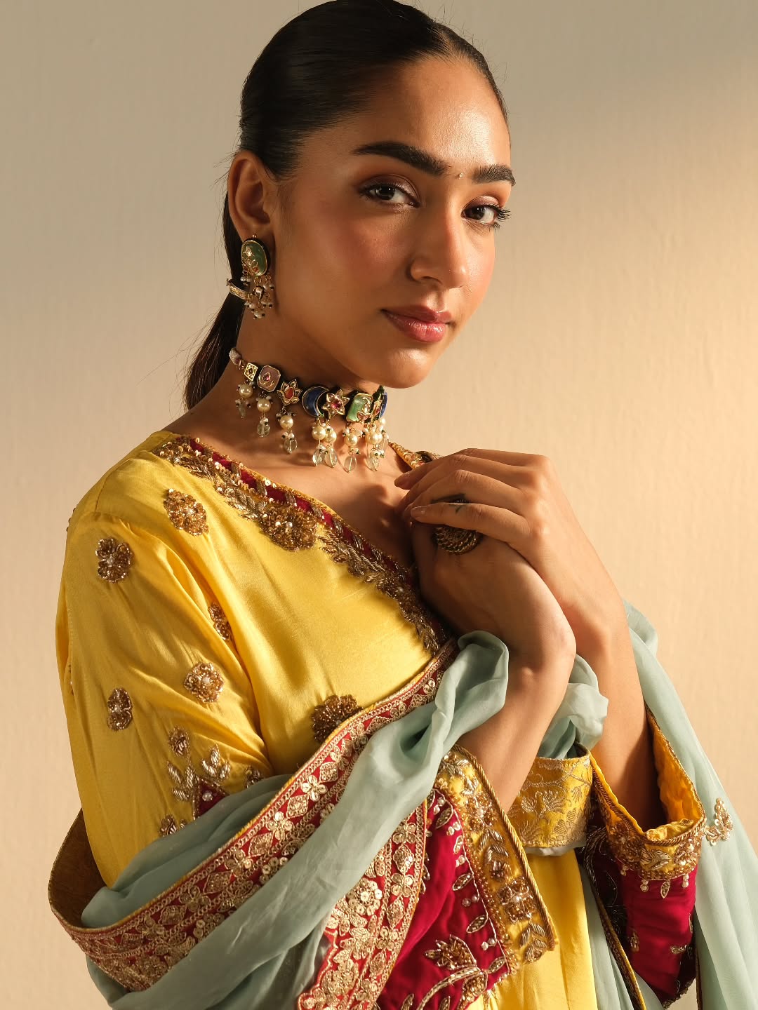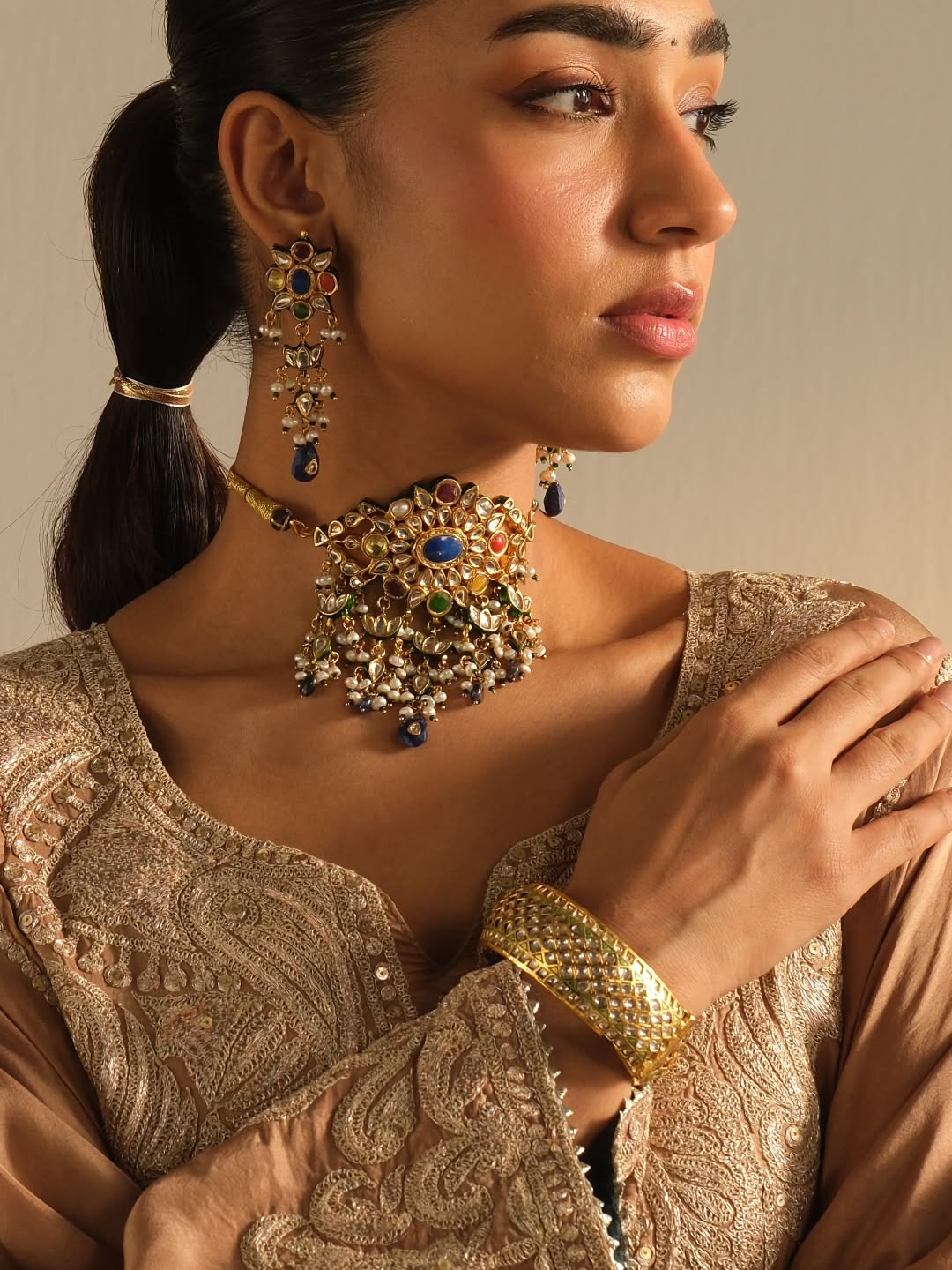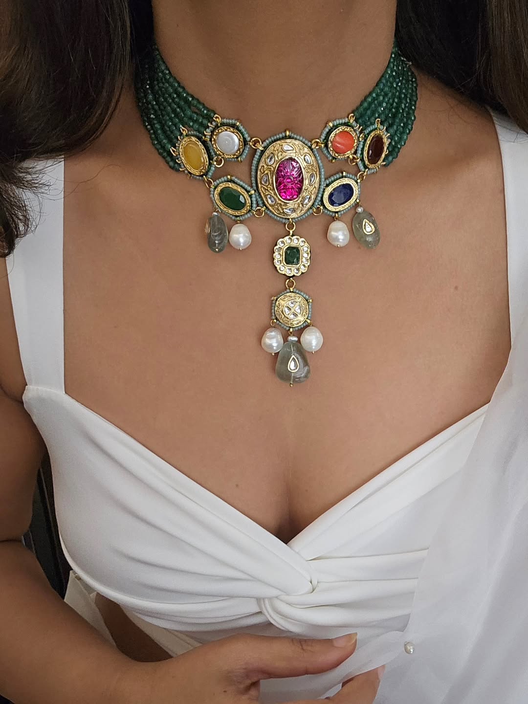 Firoza Multicolored Kundan Necklace Set with Tikka & Nath | RASA Jewels