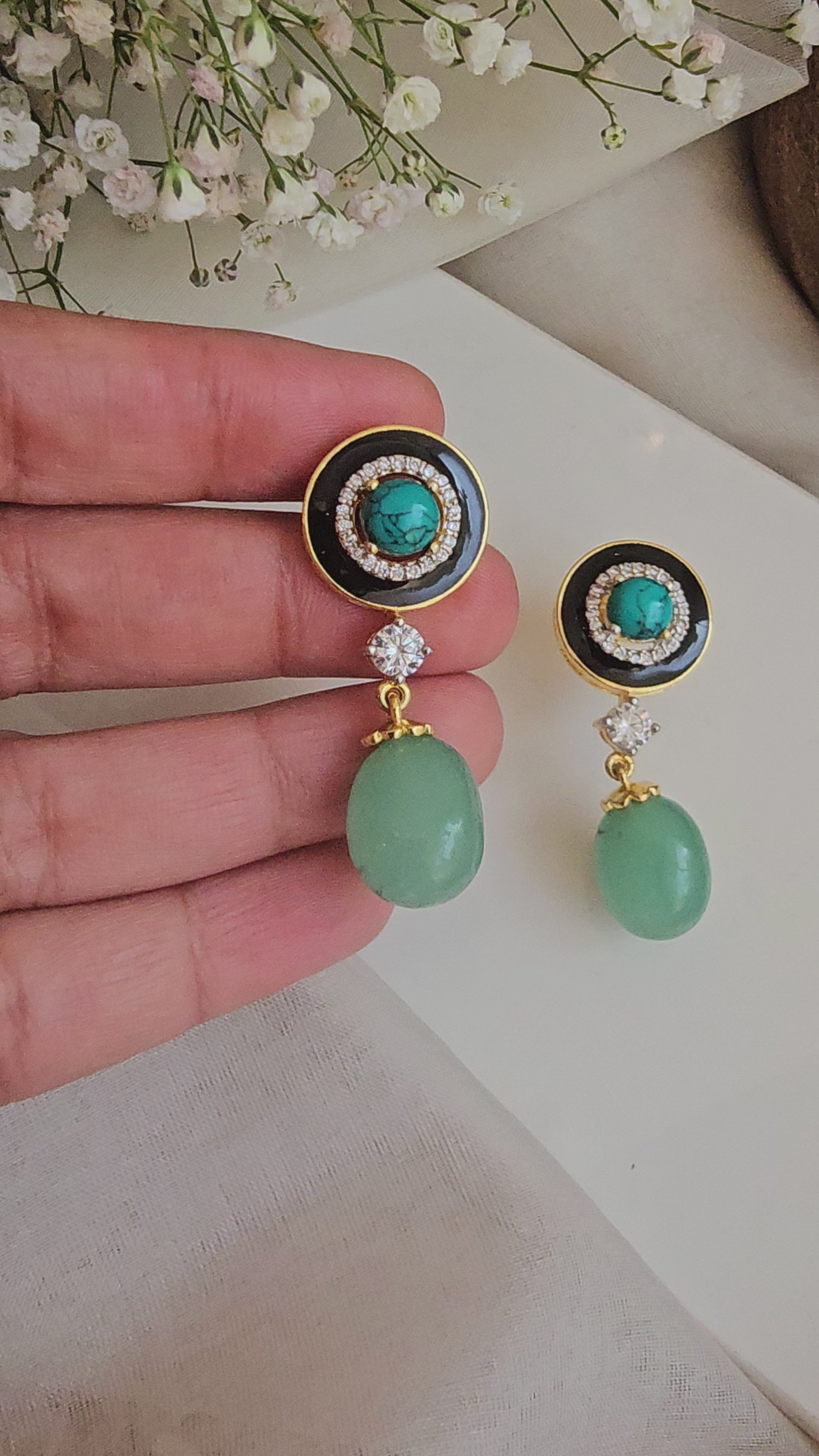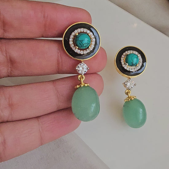 Gold plated black enamel round turquoise earrings with a green drop.