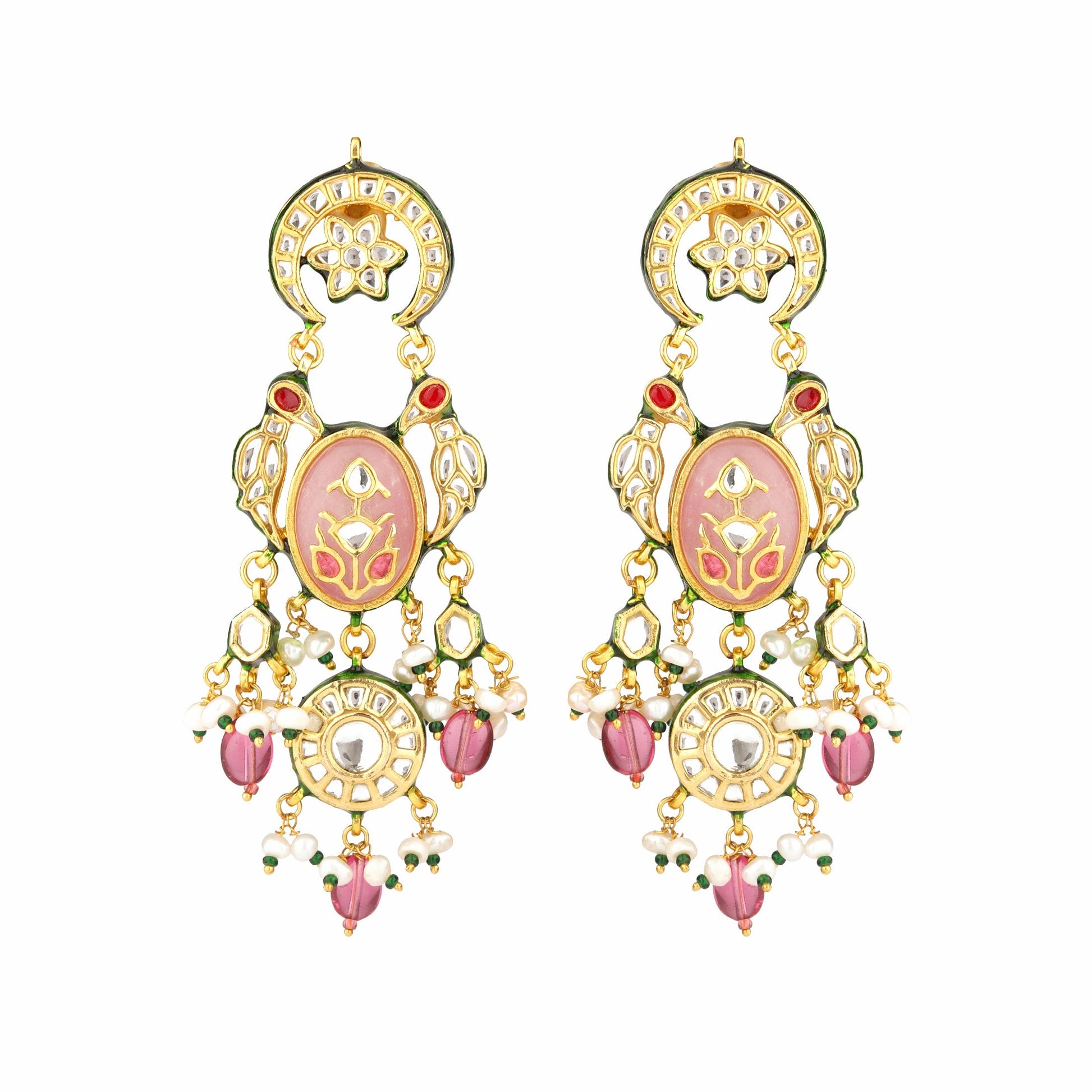 Radiate feminine charm with the Kundan Rose Quartz Long Earrings, crafted in premium silver alloy and finished with luxurious 22K 4-micron gold plating. Adorned with delicate rose quartz stones and traditional kundan work, these earrings exude elegance with a soft, romantic touch.